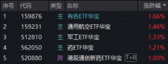 盘面上,有色金属板块领涨两市,揽尽有色金属行业龙头的有色ETF华宝(159876)场内价格收涨1.66%;军工、航空走势回暖,一键布局商业航天+卫星导航+低空经济+大飞机的通用航空ETF华宝(159231)、军工核心资产——军工ETF华宝(512810)场内价格收涨超1%;创新药再度走出独立行情,100%创新药研发标的——港股通创新药ETF华宝(520880)、重仓A股创新药的药ETF(562050)亦双双逆市续涨逾1%。