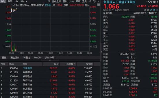 创业板人工智能ETF华宝(159363)反弹超3%,天孚通信领涨近7%!算力市场供不应求,资金连续加码