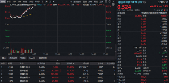 港股通创新药涨势尤为强劲,乐普生物-B、英矽智能、荣昌生物携手领涨超10%,权重龙头康方生物、信达生物、石药集团大涨超5%,百济神州飙升逾6%!