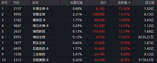 聚焦港股通创新药板块,乐普生物-B领涨超15%,荣昌生物、海西新药、维立志博-B、博安生物、亚盛医药-B等集体涨超10%!权重龙头康方生物、信达生物、中国生物制药涨超6%,百济神州涨逾7%,三生制药涨超9%。
