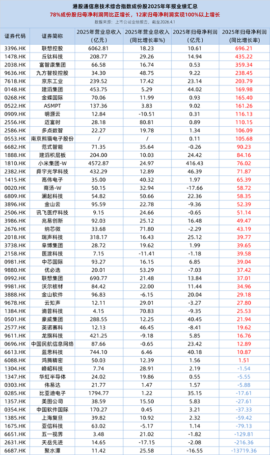 截至4月1日,中证港股通信息技术综合指数50只成份股已全部披露2025年年报业绩。据统计,50只成份股中有39家实现归母净利润同比正增长,其中12家更是实现100%以上翻倍增长。联想控股2025年归母净利润10.61亿元,同比高增696%;丘钛科技2025年归母净利润14.94亿元,同比高增435%;小米集团-W狂揽416亿元净利润,同比大增76%!