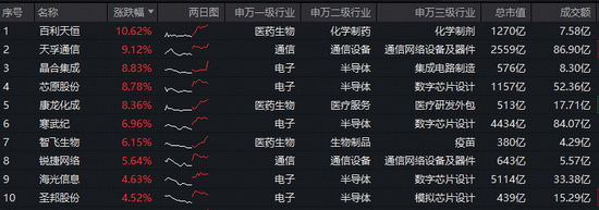成份股方面,医药生物龙头百利天恒领涨超10%,康龙化成涨逾6%,智飞生物涨超6%;半导体龙头晶合集成、芯原股份涨逾8%;光模块龙头天孚通信涨超9%。