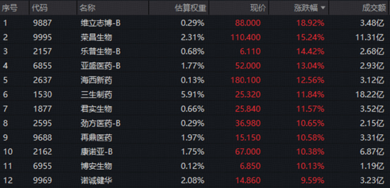港股通创新药ETF华宝(520880)罕见十余只成份股齐涨超10%,维立志博-B午后惊人暴涨超21%创历史新高!权重龙头荣昌生物、三生制药各涨15.24%、11.84%,百济神州、中国生物制药涨近8%。