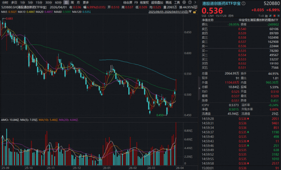 港股通创新药攻势尤为迅猛,520880午后涨幅最高飙至7.19%,收盘强势站上半年线!全天成交10.84亿元,创2025年8月4日以来新高!