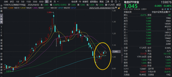今日(4月2日)市场盘整,A股主要指数悉数飘绿,揽尽有色金属行业龙头的有色ETF华宝(159876)随市小幅回调,场内价格微跌0.48%,从日k线上看,自3月23日本轮低点以来,或已走出震荡上行台阶。