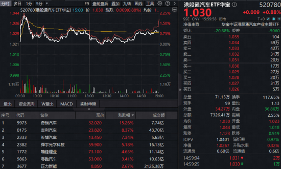 尾盘狂飙!奇瑞汽车爆量涨超15%!新能源汽车迎多重利好,港股通汽车ETF华宝(520780)逆市上涨!