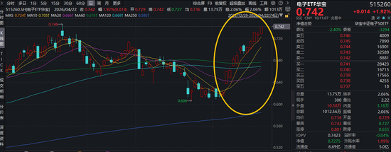 热门ETF方面,4月22日,荟聚电子板块核心龙头的电子ETF华宝(515260)场内涨幅盘中拉升1.92%,冲击日线5连阳,近12个交易日中,有10个交易日上涨,距离历史高点(0.746)仅一步之遥!值得一提的是,该ETF昨天单日吸金723万元,反映资金看好电子板块后市表现,积极进场布局!