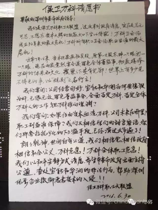 这封署名为“保卫万科职工大联盟”的信是向深圳市委政府请愿,言辞颇为激烈,直言“万科正面临成立32年来的最大危机”,并质问:“公司经营向好,宝能和华润为何要狼狈为奸,无缘无故罢免监事会,全面否定万科,否定全体万科人的工作,把万科推向深渊?”