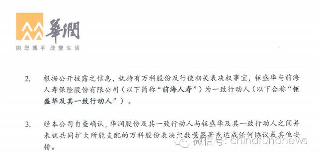 华润向外界撇清:别误会啊别误会啊,我们央企华润和宝能系不是一伙的。我们和宝能没有结成同盟,不是外界猜测的互为一致行动人。