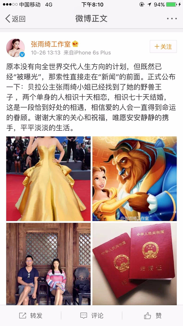 张雨绮工作室微博称:“原本没有向全世界交代人生方向的计划,但既然已经’被曝光’,那索性直接走在’新闻’的前面。正式公布一下:贝拉公主张雨绮小姐已经找到了她的野兽王子 ,两个单身的人相识十天相恋,相识七十天结婚,这是一段恰到好处的相遇,相信爱的人会一直得到命运的眷顾。谢谢大家的关心和祝福,唯愿安安静静的携手,平平淡淡的生活。”
