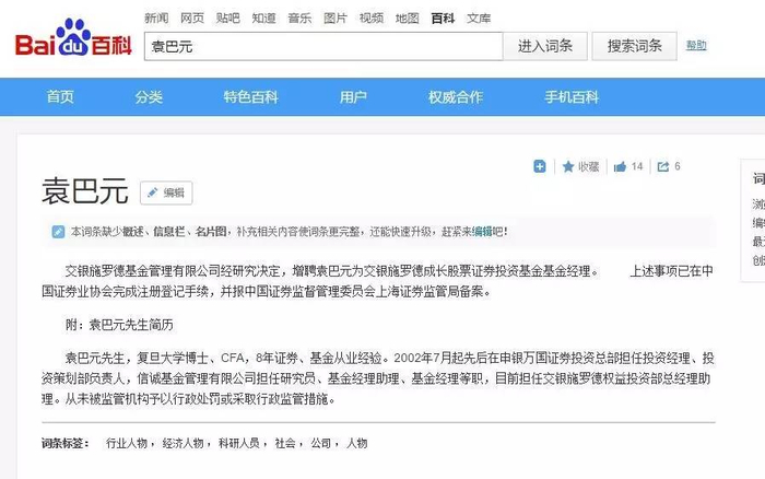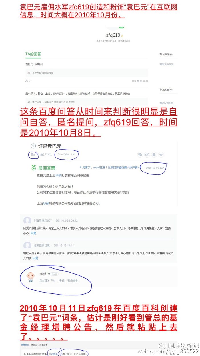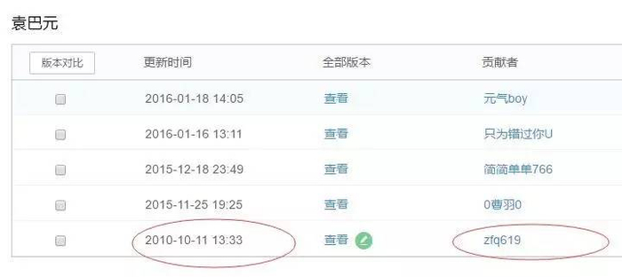 百度百科的“袁巴元”词条是一个叫“zfq619 ”的网友(有的说其实是水军)在2010年10月创建的。