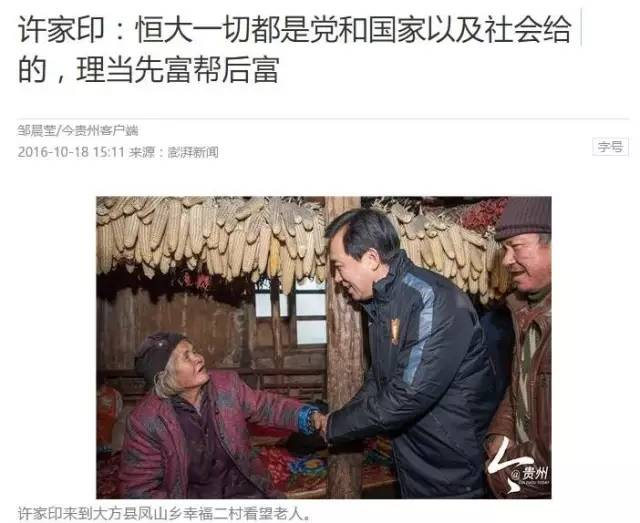10月16日,在京召开的全国脱贫攻坚奖表彰大会公布了2016年全国脱贫攻坚奖获奖名单,共有38人分获奋进奖、贡献奖、奉献奖和创新奖。其中包括了多名工商企业界人士,中国恒大集团主席许家印最终获得奉献奖。10月18日,贵州日报报业集团旗下的《今贵州》手机新闻客户端发布《许家印:恒大的一切都是党和国家以及社会给的,理当先富帮后富》一文。