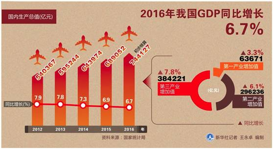 国家统计局官方数据显示, 2016年中国GDP增速为6.7%,全年国内生产总值为74.41万亿元人民币。简单用2016年年底汇率测算,对应美元约10.7万亿美元。