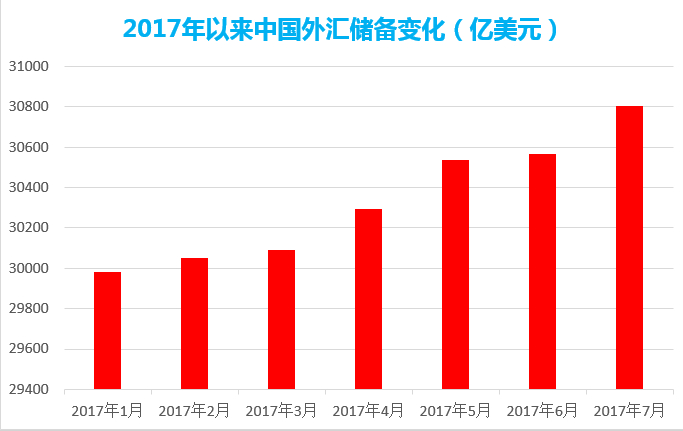 外汇储备增加也是带动人民币升值的又一重要原因。中国人民银行8月公布的数据显示,截至2017年7月末,外汇储备规模30807亿美元,较6月末上升239亿美元,升幅为0.8%,为连续第6个月出现回升。