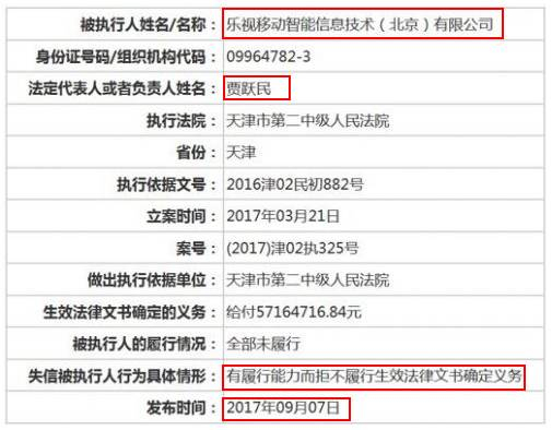 上述信息显示,由于乐视控股未给付5008万元和5716万元,乐视控股(北京)被天津市第二中级人民法院列为失信被执行人,两案立案时间分为为2017年4月和3月。另外,乐视移动因上述的5716万元也被天津市第二中级人民法院列为失信被执行人。两家公司涉及失信金额总共超过1亿元。