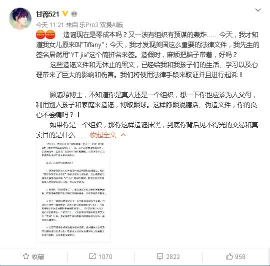 甘薇也在微博上发声明否认了这一传闻,称自己并没有一个名为“Tiffany”的女儿,丈夫也不会蠢到用“YT Jia”这样的简拼来签字。她还表示这些造谣文件和无休止的黑文已经给自己的家庭和孩子造成了巨大的影响和伤害,自己将通过法律武器来维护自己。并质问消息发布者:“你的良心不会痛吗?!”