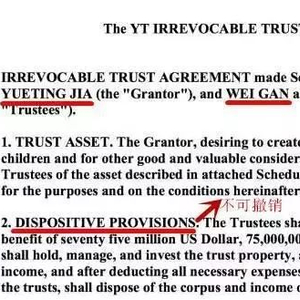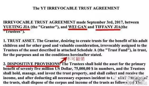 今天上午,某自媒体发文晒出贾跃亭美国信托文件,称其已“胜利大逃亡”。根据其说法,贾跃亭给Tiffany Jia(贾跃亭其中的一个女儿),留了7500万美金,约合五亿人民币,甘薇是信托基金守信委托人。他的几个孩子将分别得到了不同的信托基金,金额大概相当。