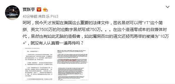 晚间,贾跃亭也发表辟谣微博,称“在这个造谣零成本的自媒体时代,居然也有如此无脑的造假者,如此漏洞百出的谣文还轻而易举的被捧为“10万+”,就没有人认真看一遍再传吗? ”