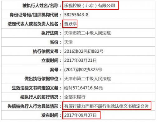 根据最高人民法院中国执行信息网公布的信息,乐视控股(北京)有限公司和乐视移动智能信息技术(北京)有限公司近日被列入了全国的失信执行人名单。其中,公司法人代表分别为贾跃亭和贾跃民。
