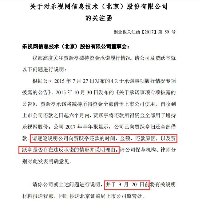 贾跃亭的这种行为也引发了深交所的关注,9月12日晚,深交所发布关注函,要求乐视网逐笔说明公司向贾跃亭还款的时间、金额、还款原因,以及贾跃亭是否存在违反承诺的情形并说明理由。