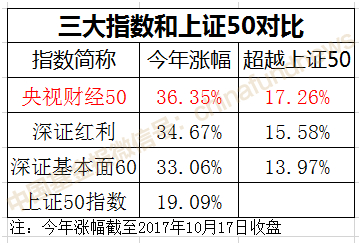 基金君统计显示,央视财经50、深证红利、和深证基本面60指数今年以来都出现了连续上涨,截至10月17日今年以来的涨幅都超过了33%。