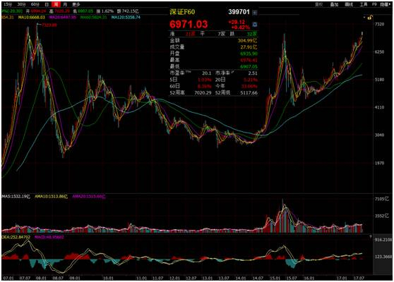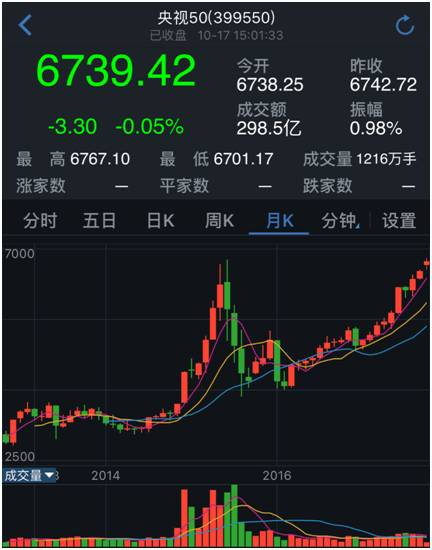 先看看央视财经50指数的月线,2017年以来的10个月中,只有7月份收出小阴线,其他9根都是阳线,2017年年初以来涨幅达到了36.35%,超过同期上证50指数涨幅17.26个百分点,并且在昨日创出了历史新高6808.29点。