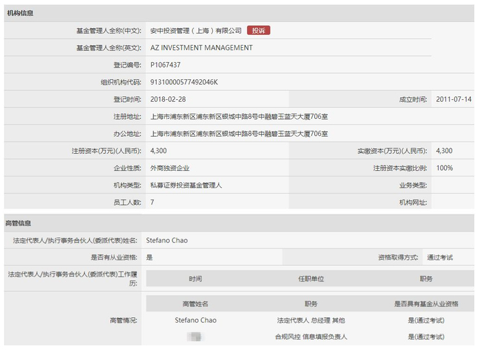 基金业协会备案信息显示,安中投资管理(上海)有限公司成立于2011年7月14日,在今年2月28日拿到PFM牌照,注册资本金为4300万元,实缴比例100%,属于外商独资的私募证券管理人。该公司法定代表人是Stefano Chao。按照协会的规定,安中投资将在6个月内发行首只私募基金。