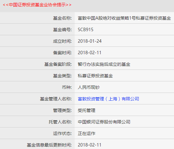 从备案信息看,该产品名为富敦中国A股绝对收益策略1号私募证券投资基金,1月24日成立,2月11日完成备案,由中国银河证券负责发行。