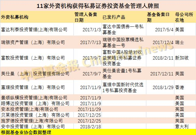从去年到现在,富达利泰投资、瑞银资管、富敦投资、英仕曼投资、惠理投资、景顺纵横投资、路博迈投资、安本投资、贝莱德投资、施罗德投资、安中投资等11家外资机构先后在基金业协会完成备案登记。