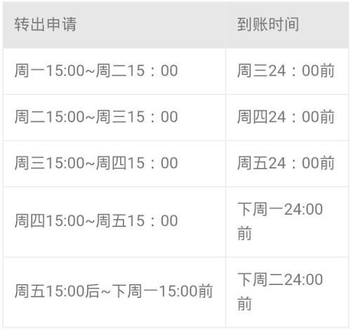 特别要注意一点,节假日前一天15:00前转出的,将在节假日后第一个工作日到账,节假日前一天15:00后转出的,将在节假日后第二个工作日到账。