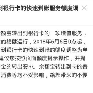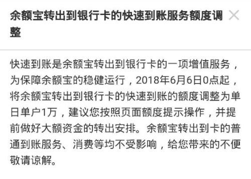 今年6月6日起,余额宝转出到银行卡的快速到账额度调整为每个人每天1万元,其他功能不受影响。