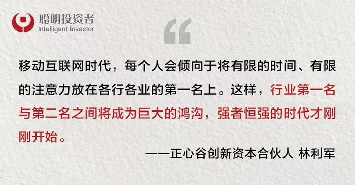 移动互联网时代,每个人会倾向于将有限的时间、有限的注意力放在各行各业的第一名上。这样,行业第一名与第二名之间将成为巨大的鸿沟,强者恒强的时代才刚刚开始。