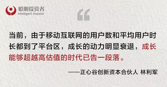 当前,由于移动互联网的用户数和平均用户时长都到了平台区,成长的动力明显衰退,成长能够超越高估值的时代已告一段落。