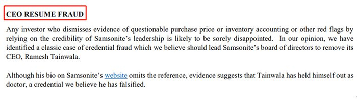 新秀丽CEO,Ramesh Tainwala,在各场合都自称自己是一名博士,但实际上他从未获得博士学位,只是在1992年-1993年期间参与了学院的一个项目而已。Blue Orca称这种造假足以将Tainwala从CEO位置上拉下来。