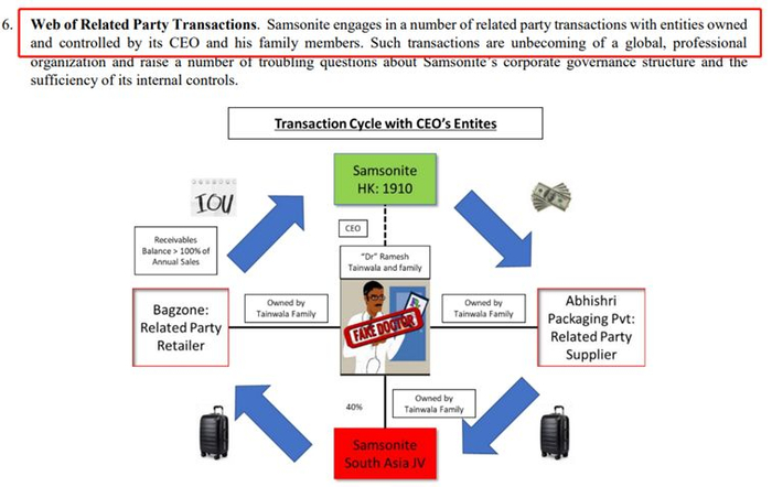 比如新秀丽南亚合营公司(South Asian JV),该公司由新秀丽与Tainwala家族合营,股权分配是60%和40%。按道理,这种关联交易,新秀丽的审计团队应该高度监视,但实际上并没有:请的审计是印度注册的小公司,连个网址都没有;南亚也缺乏内部管理等等。