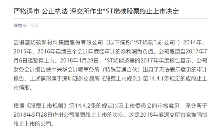 5月28日晚间,深交所作出*ST烯碳股票终止上市决定。