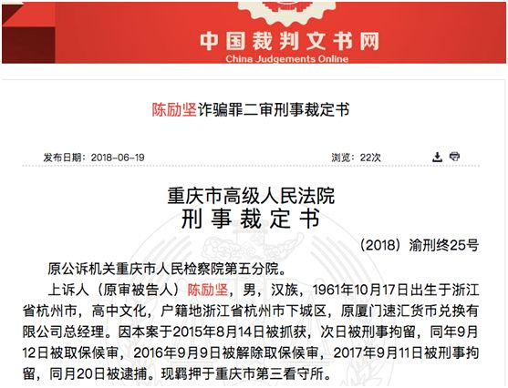 今日,裁判文书网公布了陈励坚诈骗罪二审刑事裁定书。基金君扒了近2万字的裁定书,理清了这个诈骗案的脉络。