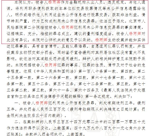 2012年5月4日,杨丙卿被公安部证券犯罪侦查局第一分局刑事拘留,同年6月9日被批准逮捕。2013年4月,杨丙卿被市二中院一审以利用未公开信息交易罪判处其有期徒刑2年,罚金222万余元。