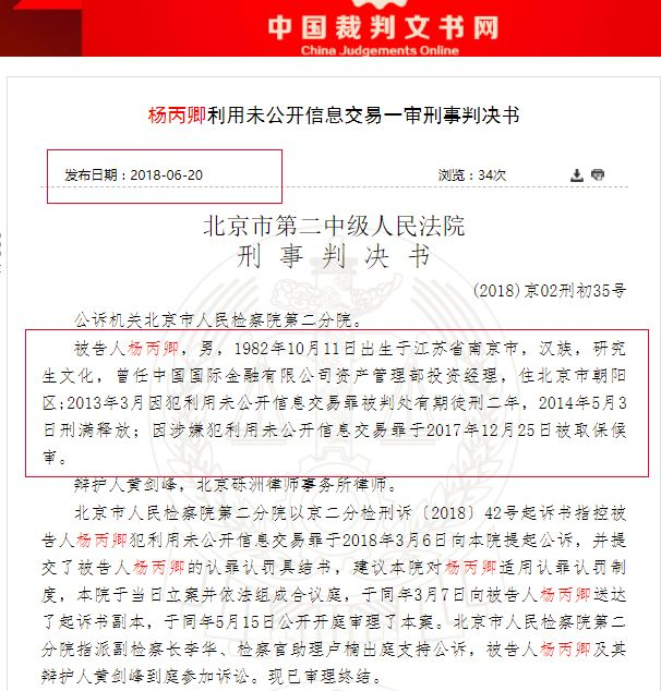 6月20日,由北京市第二中级人民法院审理的杨丙卿案在裁判文书网公布。