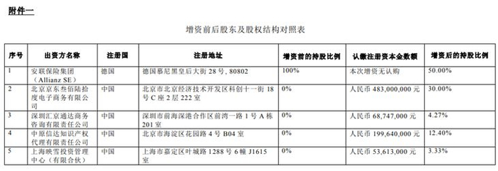 增加注册资本的同时,安联财险引入了新的投资人,由外资独资公司转变为中外合资险企。其中,北京京东叁佰陆拾度电子商务有限公司认购新增注册资本中的4.83亿元,增资后持股达30%;中原信达知识产权代理有限责任公司认购新增注册资本中的1.9964亿元,增资后持股12.4%;深圳汇京通达商务咨询有限责任公司、上海映雪投资管理中心(有限合伙)分别认购新增注册资本中的6874.7万元、5361.3万元,增资后持股比例分别为4.27%、3.33%;安联保险的持股比例则由100%降至50%。