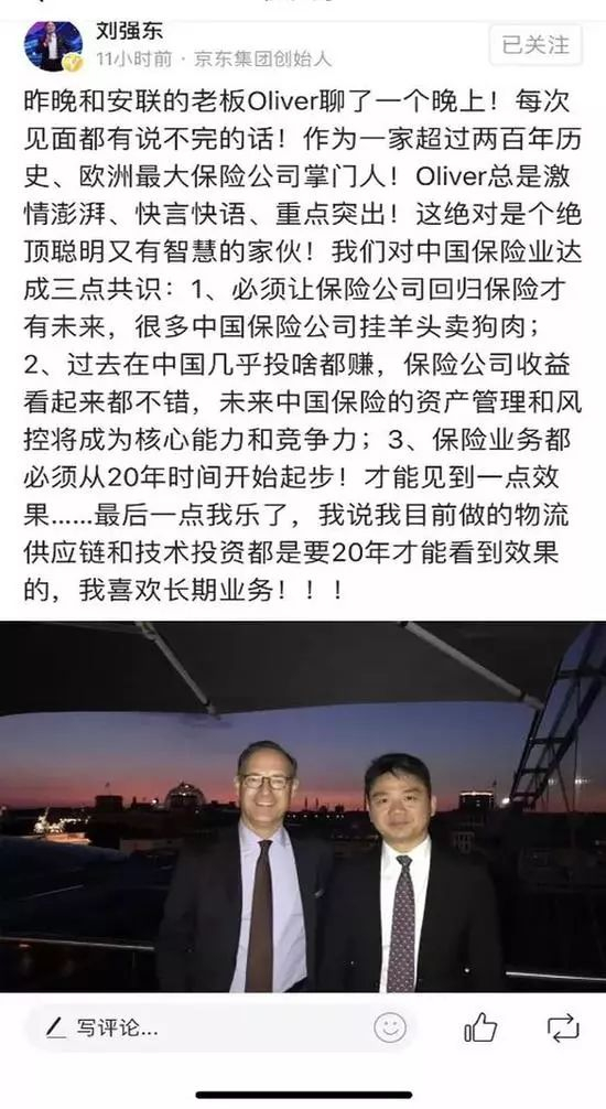 刘强东对保险行业有着自己独特见解。刘强东7月9日曾发文称:“很多中国保险公司是挂羊头卖狗肉,必须让保险公司回归保险才有未来;过去在中国几乎投啥都赚,保险公司收益看起来都不错,但未来中国保险的资产管理和风控将成为核心能力和竞争力;另外,保险业务都必须从20年时间开始起步,才能见到一点效果。因为京东目前做的物流供应链和技术投资都是要20年才能看到效果的,看好长期业务。”