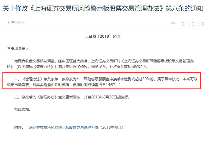 一、《管理办法》第八条第二款修改为:“风险警示股票盘中换手率达到或超过30%的,属于异常波动,本所可以根据市场需要,对其实施盘中临时停牌,停牌时间持续至当日14:57。”
