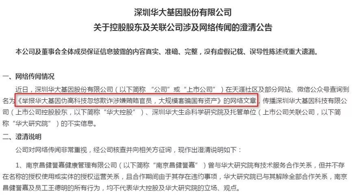 华大基因部分澄清公告截图