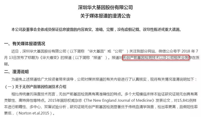7月,《华大癌变》一文流传,质疑其主营业务无创产前DNA筛查,未能起到筛查作用,最终生出生理缺陷婴儿。