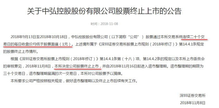 11月8日晚间,深交所作出中弘股份终止上市决定,原因是9月13日至10月18日,其连续20个交易日每日收盘价均低于股票面值(1元)。