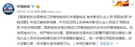 6月3日,央视新闻报道,国家税务总局责成江苏等地税机关调查核实“阴阳合同”涉税问题。