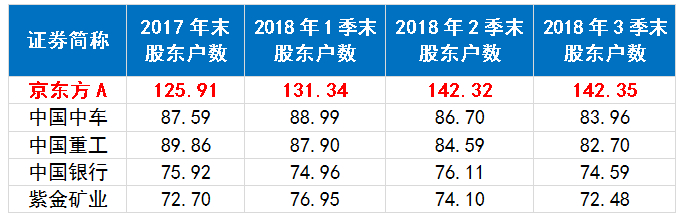 不过,京东方A仍受股民追捧,2017年底公司股东数为125.91万户,而截至2018年3季报,股东数已增至142.35万户。甚至深受万科独立董事刘姝威“热捧”。