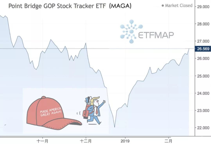 MAGA:这支ETF有一个非常好的股票代码,显然灵感来自特朗普的“让美国再次成为伟大(Make America Great Again)”的口号——但这是一个值得怀疑的投资论点。该公司从标准普尔500指数中选出那些员工和政治行动委员会为共和党选举候选人做出贡献的前150家公司。但并没有解释为什么这会是一种理性的投资方法。或许也因为它有着相当高的管理费,所以只吸引了3390万美元。值得注意的是,类似的基金:共和党政策基金(GOP)和民主政策基金(DEMS)几乎没有大张旗鼓地推出。它们未能吸引很多资产,并且都在去年四月关闭。