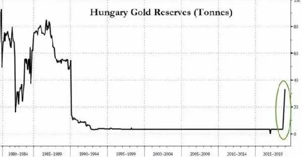 匈牙利央行一出手就是猛招,2018年黄金增加规模高达十倍,硬是从3.1吨增加到31.5吨。