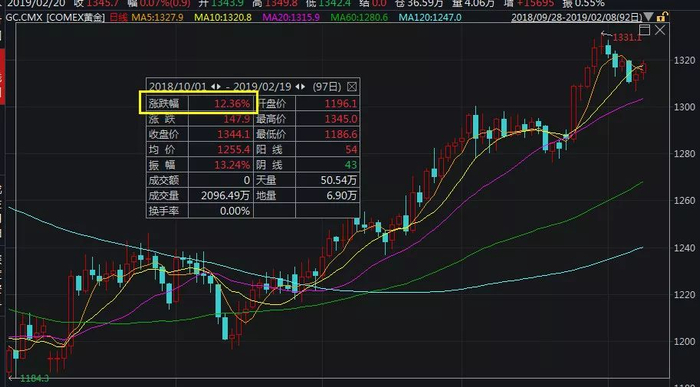 截至昨日(2月19日),COMEX黄金由1196.1美元/盎司,涨到1344.1美元/盎司,4个半月累计上涨12.36%。